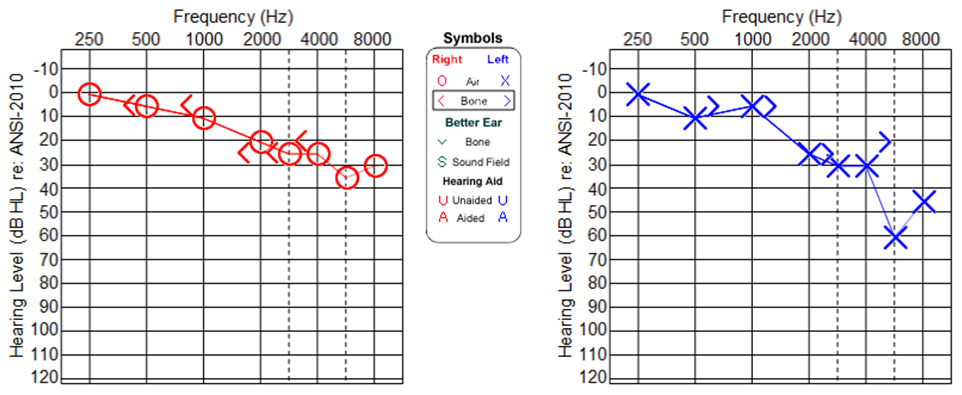 A 50-year-old gentleman presented with a six month history of left sided, high pitched, continuous, nonpulsatile tinnitus with mild left sided hearing loss. He did not complain of any other otogenic symptoms and his past medical history was unremarkable. Otoscopy and cranial nerve examination were normal. His audiogram showed left high frequency sensorineural hearing loss with an average hearing threshold of 40 dB (Figure 1). An MRI IAM was organized that revealed VBD causing significant distortion and deviation of the left VI, VII, and VIII nerve complex at the level of the pontomedullary junction as well as localized mass effect and displacement of the brain stem (Figure 2). The case was discussed at the skull base multidisciplinary team meeting. Surgical intervention was not advised as the vertebral artery was not in direct contact with VIIIth nerve. As the patient’s quality of life was unaffected by his symptoms, the risks of surgery were outweighed by the benefits. No intervention was made and the patient was discharged as per their request. The patient’s general practitioner (GP) was advised to review and manage modifiable risk factors for ischemic stroke and refer to the stroke team for consideration of antiplatelet therapy.
