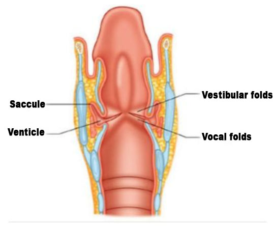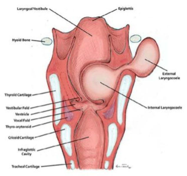 Laryngocele is rare and was first reported as air containing tumors in 1829. However, the first laryngeal cyst in a newborn was published in 1876 [9]. Laryngocele is an air-filled mass arising from herniation of the laryngeal saccule which is a blind-ended structure that opens into the laryngeal ventricle [5]. The laryngeal ventricle is a fusiform fossa situated between the false and true vocal folds (Figure 1).
