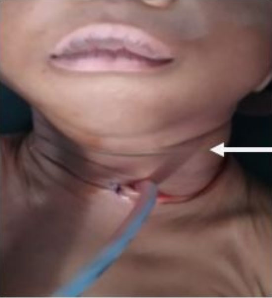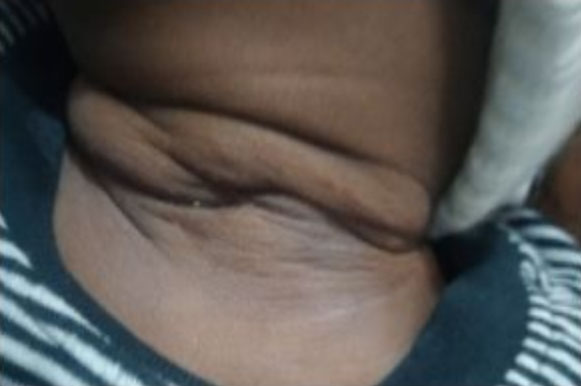 Our patient is a 29-day-old male neonate who was referred by the pediatrics team of our facility on account of respiratory distress and regurgitation of feeds and a left-sided neck mass since birth which has been increasing in size. He was a normal appearing 2500 g, full-term baby with no significant prenatal medical history and he had APGAR score of 8 at 1 and 9 at 5.