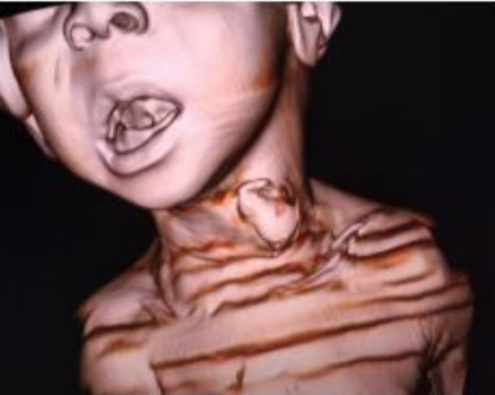 A computed tomography (CT) scan described a 25 mm by 22 mm well circumscribed thin-walled air-filled mass on the neck extending to the airway with narrowing of the laryngeal air column. The 3D image is shown in Figure 4.