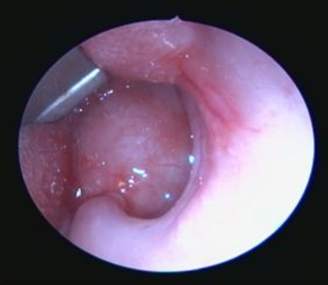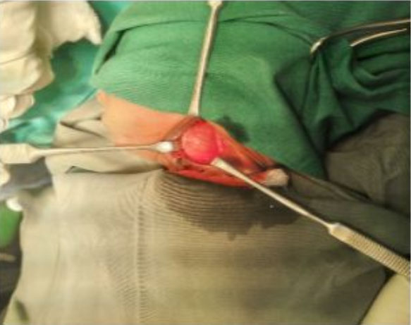 Pre-operative workup was done for the patient and consent was taken for excision of laryngocele ± tracheostomy in case of difficult intubation. Prior to surgical excision of the mass, there was a need to perform a tracheostomy as the baby could not be intubated (Figure 3). Direct laryngoscopy augmented with 2.7 0° endoscope was done under general anesthesia before the excision of the neck mass which showed a left-sided supraglottic mass covered with normal mucosa extending into the airway with significant narrowing of the larynx (Figure 5). Excision of the laryngocele was performed via an external cervical approach (Figure 6). The post-operative period was uneventful with antibiotic [intravenous (iv) ceftriaxone)], analgesic, and steroid. He was decannulated three days post-op. Following decannulation, no pre-operative symptoms (stridor and respiratory distress) were observed. The stoma and left lateral neck wounds were well apposed. Histologic report confirmed diagnosis of congenital laryngocele. A repeat endoscopy was not carried out post-surgery due to lack of pediatric flexible laryngoscope in our center, but the patient has been stable with no sign of recurrence of preoperative complaints and neck mass. At six months post-surgery, the baby was noticed to be healthy with no feature suggestive of recurrence (Figure 7).